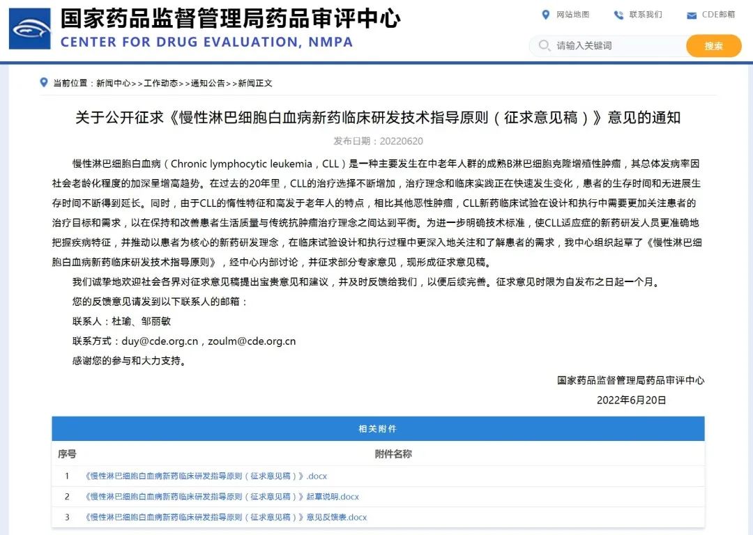 關(guān)于公開征求《慢性淋巴細胞白血病新藥臨床研發(fā)技術(shù)指導(dǎo)原則(征求意見稿)》意見的通知