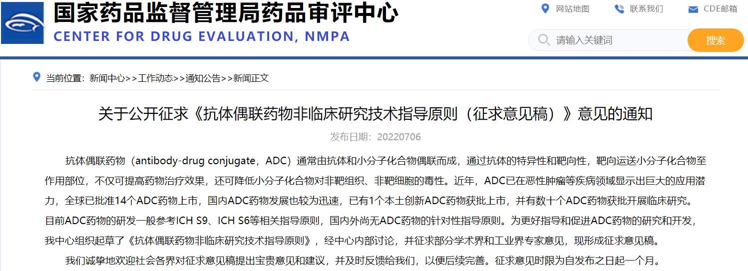 關(guān)于公開征求《抗體偶聯(lián)藥物非臨床研究技術(shù)指導(dǎo)原則(征求意見稿)》意見的通知
