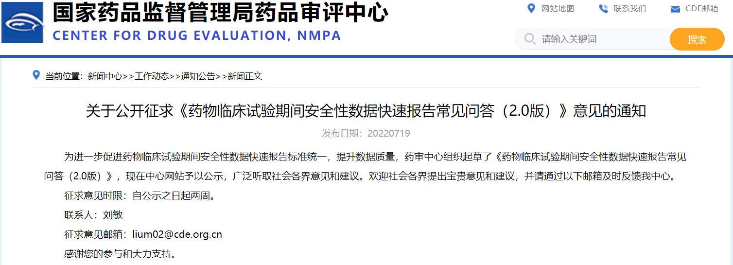 關(guān)于公開(kāi)征求《藥物臨床試驗(yàn)期間安全性數(shù)據(jù)快速報(bào)告常見(jiàn)問(wèn)答(2.0版)》意見(jiàn)的通知
