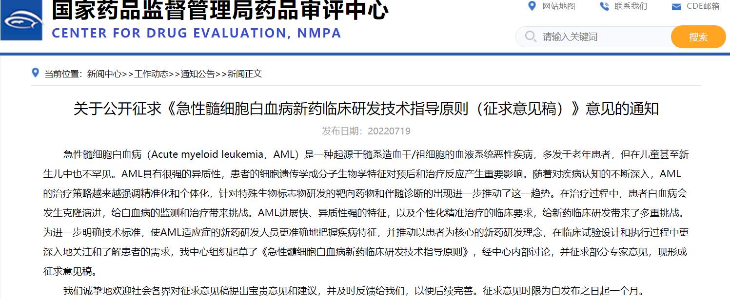 關(guān)于公開(kāi)征求《急性髓細(xì)胞白血病新藥臨床研發(fā)技術(shù)指導(dǎo)原則(征求意見(jiàn)稿)》意見(jiàn)的通知