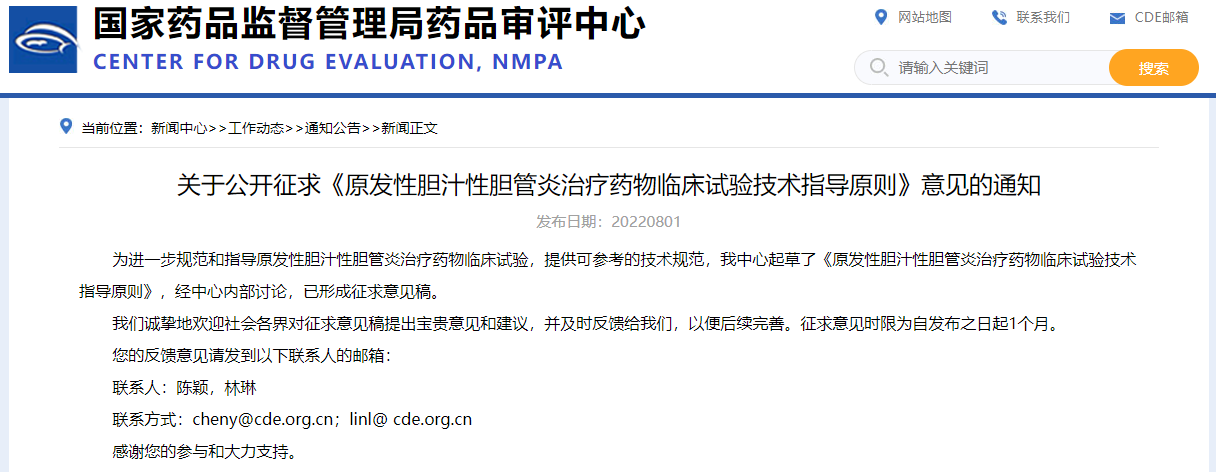 關(guān)于公開征求《原發(fā)性膽汁性膽管炎治療藥物臨床試驗(yàn)技術(shù)指導(dǎo)原則》意見的通知