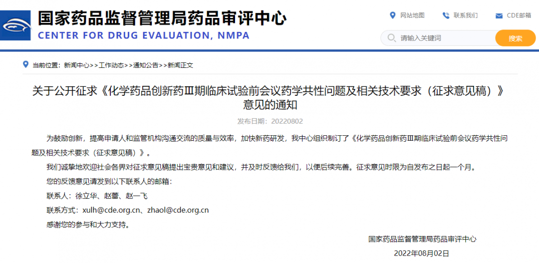 關(guān)于公開征求《化學(xué)藥品創(chuàng)新藥Ⅲ期臨床試驗(yàn)前會議藥學(xué)共性問題及相關(guān)技術(shù)要求(征求意見稿)》意見的通知