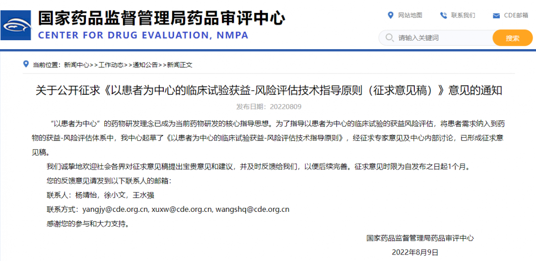 關(guān)于公開征求《以患者為中心的臨床試驗(yàn)獲益-風(fēng)險評估技術(shù)指導(dǎo)原則(征求意見稿)》意見的通知