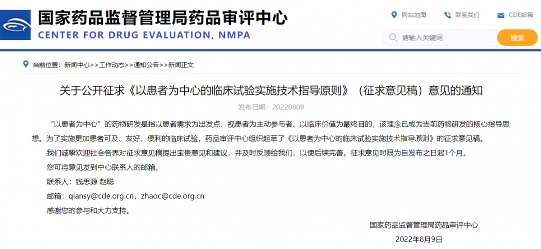 “以患者為中心”的藥物研發(fā)是指以患者需求為出發(fā)點(diǎn)、視患者為主動參與者、以臨床價值為最終目的,該理念已成為當(dāng)前藥物研發(fā)的核心指導(dǎo)思想。為了實(shí)施更加患者可及、友好、便利的臨床試驗(yàn),藥品審評中心組織起草了《以患者為中心的臨床試驗(yàn)實(shí)施技術(shù)指導(dǎo)原則》的征求意見稿。我們誠摯歡迎社會各界對征求意見稿提出寶貴意見和建議,并及時反饋給我們,以便后續(xù)完善。征求意見時限為自發(fā)布之日起1個月。