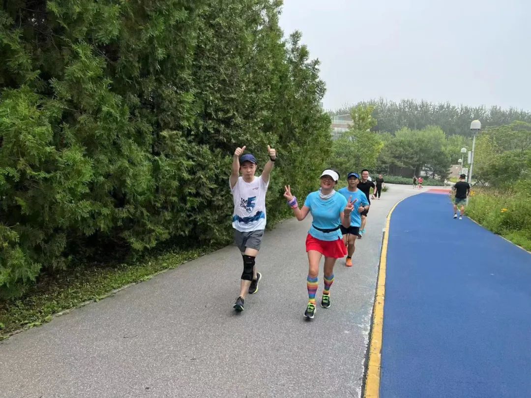 尹老師是北京馬拉松協(xié)會專業(yè)配速員,今年醫(yī)藥天團備戰(zhàn)期間,她與另外兩個專業(yè)老師在奧森帶領大家一起拉練?!敢驗橛械男』锇槭堑谝淮螀⒓覤MW越山向海,所以我們在北京奧森公園組織了兩次爬坡集訓。在這過程中,我們也分享了無傷完賽的諸多注意事項?!箯呐芮皽蕚浠顒拥脚芎罄熘笇В趥滟愑柧氝^程中,尹小紅老師將自己在北馬協(xié)會中學到的理念,毫無保留地分享給參賽團隊。