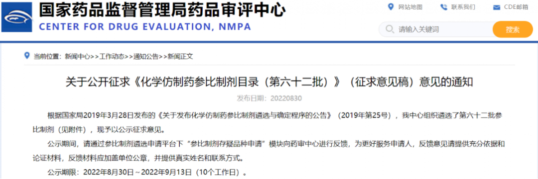 關(guān)于公開征求《化學(xué)仿制藥參比制劑目錄(第六十二批)》(征求意見稿)意見的通知
