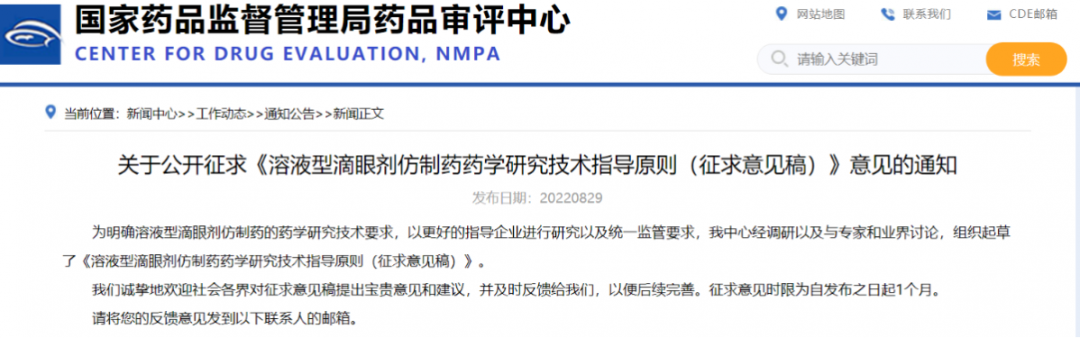 關(guān)于公開征求《溶液型滴眼劑仿制藥藥學(xué)研究技術(shù)指導(dǎo)原則(征求意見稿)》意見的通知
