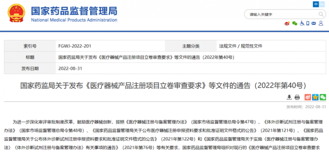 國家藥監(jiān)局關(guān)于發(fā)布《醫(yī)療器械產(chǎn)品注冊(cè)項(xiàng)目立卷審查要求》等文件的通告(2022年第40號(hào))