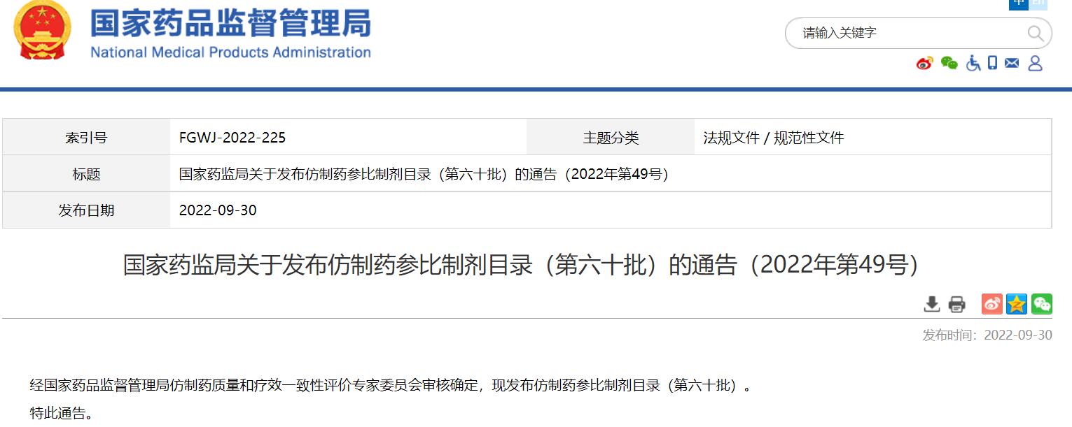 國(guó)家藥監(jiān)局關(guān)于發(fā)布仿制藥參比制劑目錄(第六十批)的通告(2022年第49號(hào))