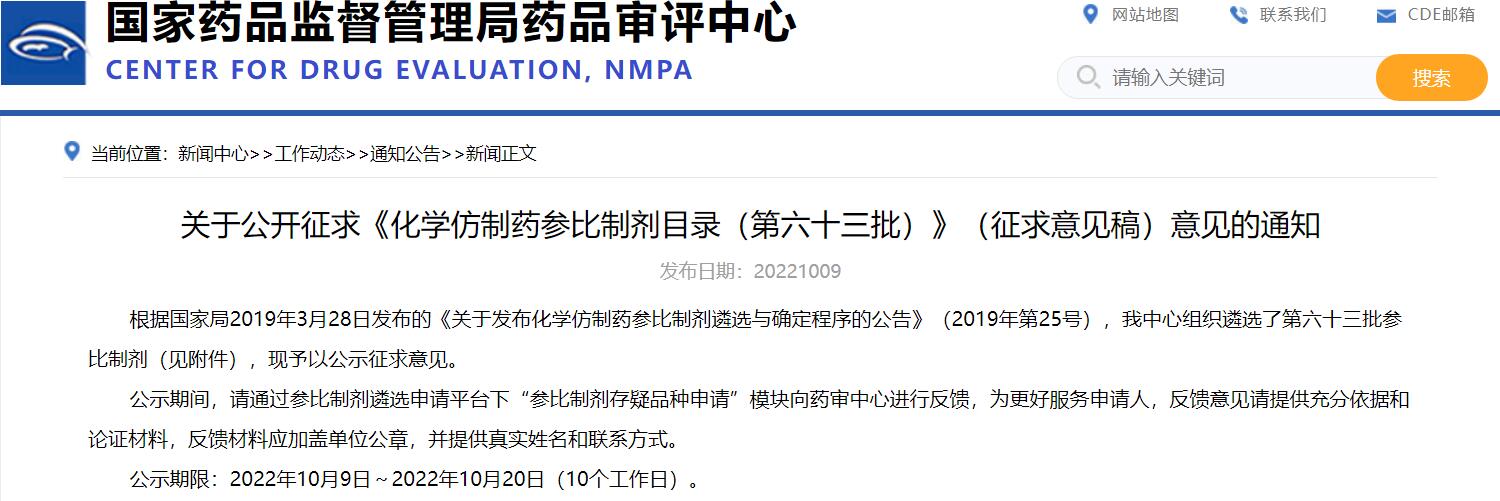 關(guān)于公開征求《化學(xué)仿制藥參比制劑目錄(第六十三批)》(征求意見稿)意見的通知
