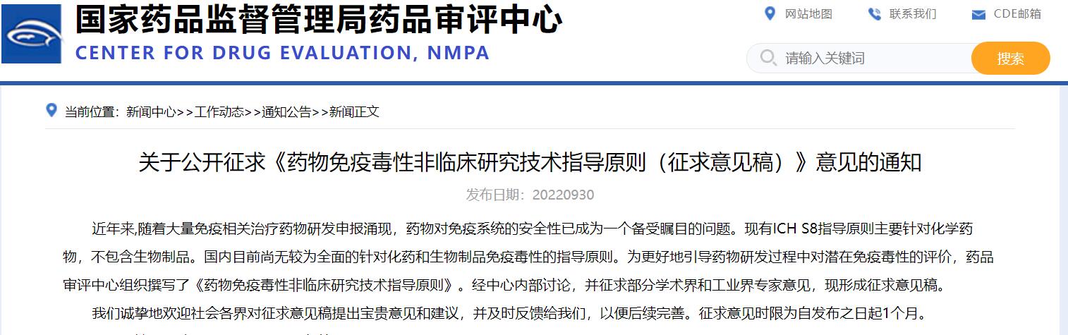關(guān)于公開征求《藥物免疫毒性非臨床研究技術(shù)指導(dǎo)原則(征求意見稿)》意見的通知