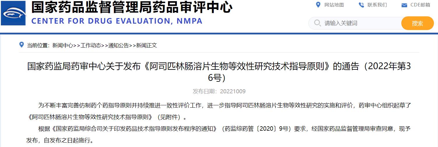 國(guó)家藥監(jiān)局藥審中心關(guān)于發(fā)布《阿司匹林腸溶片生物等效性研究技術(shù)指導(dǎo)原則》的通告(2022年第36號(hào))