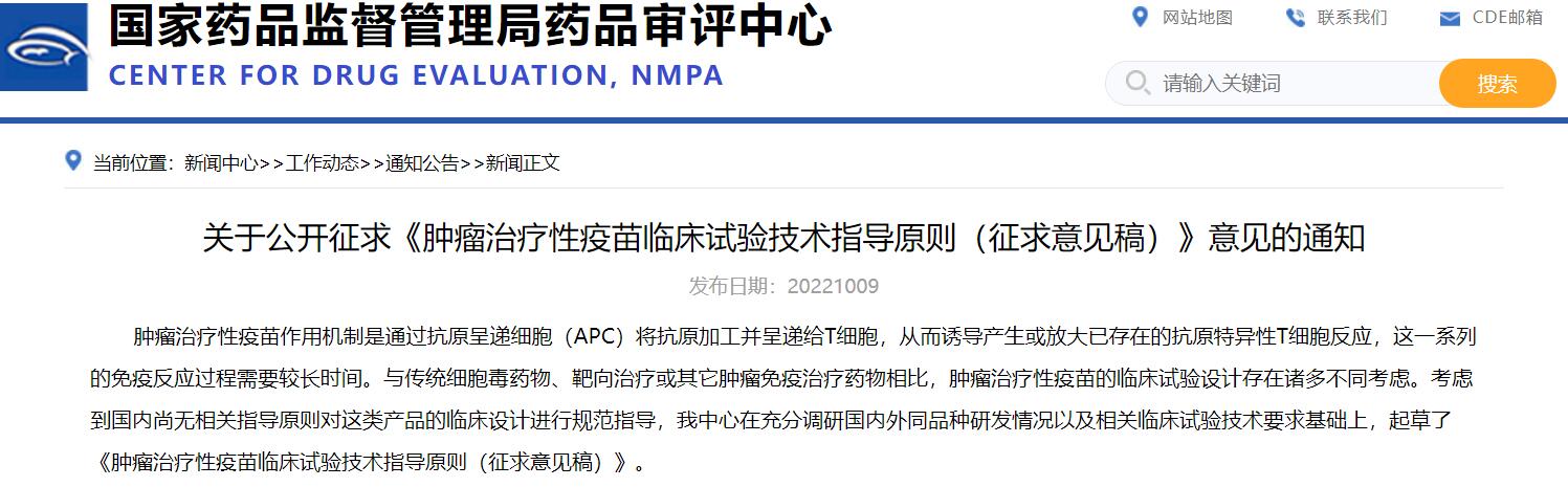 關(guān)于公開征求《腫瘤治療性疫苗臨床試驗(yàn)技術(shù)指導(dǎo)原則(征求意見稿)》意見的通知
