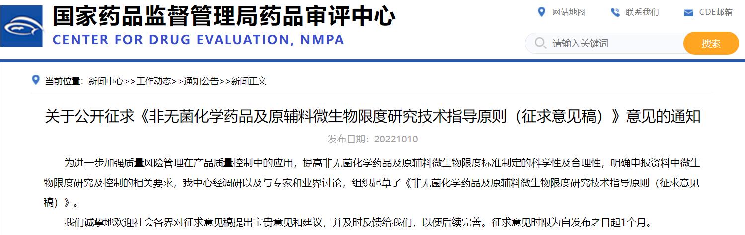 關(guān)于公開征求《非無(wú)菌化學(xué)藥品及原輔料微生物限度研究技術(shù)指導(dǎo)原則(征求意見稿)》意見的通知