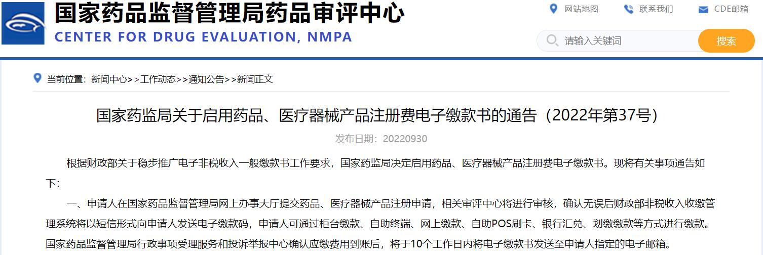國(guó)家藥監(jiān)局關(guān)于啟用藥品、醫(yī)療器械產(chǎn)品注冊(cè)費(fèi)電子繳款書的通告(2022年第37號(hào))
