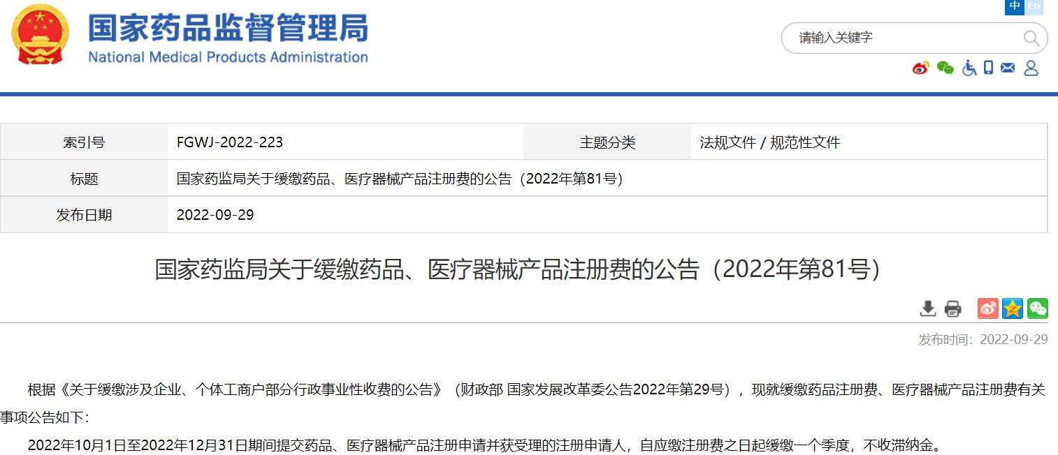 國(guó)家藥監(jiān)局關(guān)于緩繳藥品、醫(yī)療器械產(chǎn)品注冊(cè)費(fèi)的公告(2022年第81號(hào))