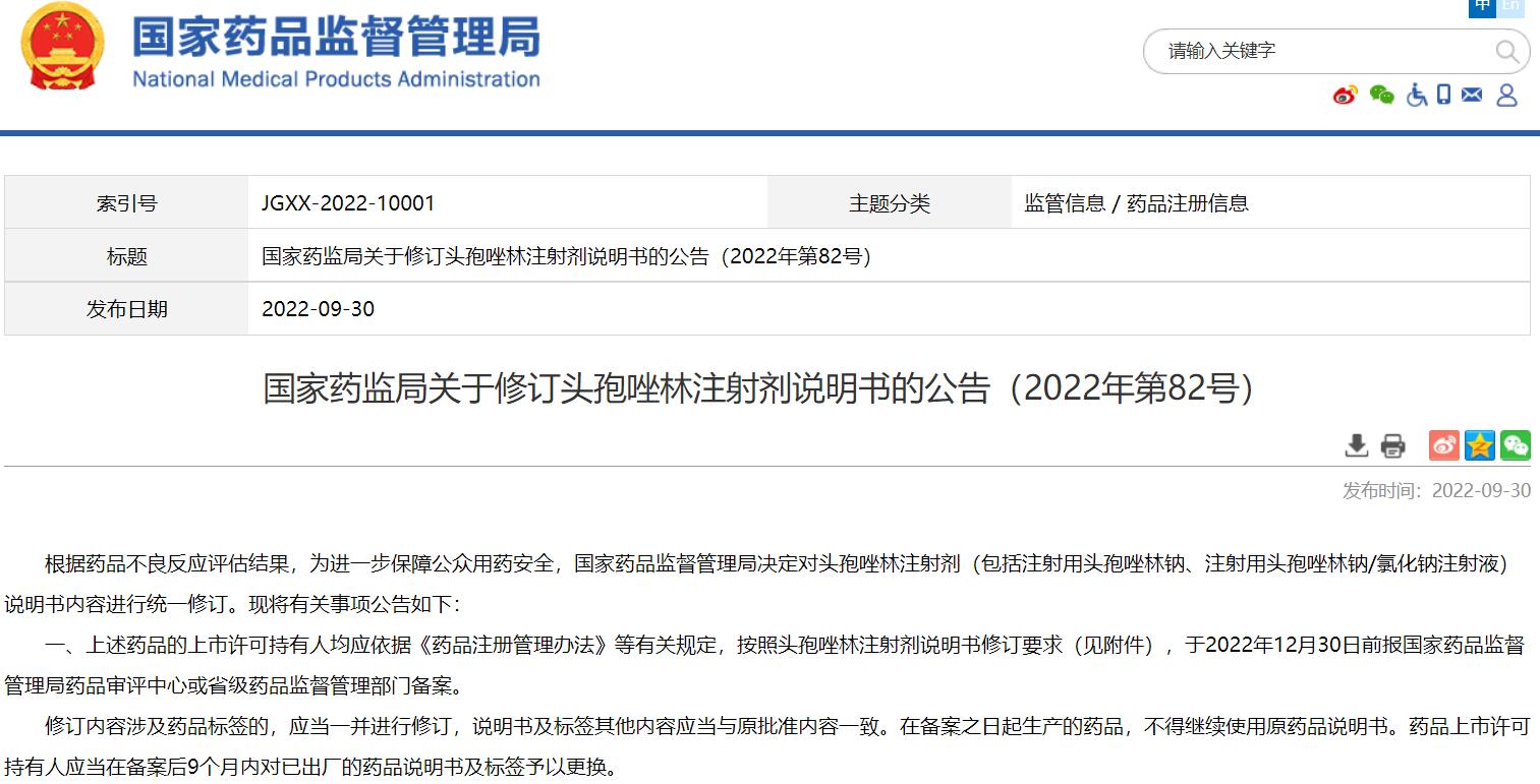 國(guó)家藥監(jiān)局關(guān)于修訂頭孢唑林注射劑說明書的公告(2022年第82號(hào))
