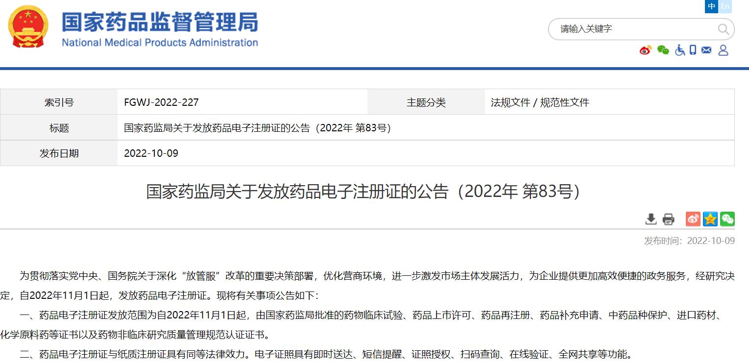 國(guó)家藥監(jiān)局關(guān)于發(fā)放藥品電子注冊(cè)證的公告(2022年 第83號(hào))