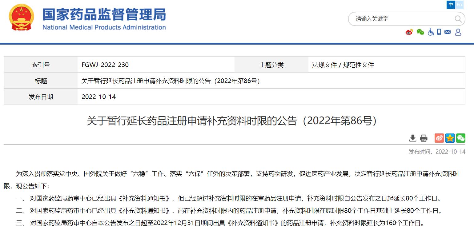 關(guān)于暫行延長藥品注冊申請補充資料時限的公告(2022年第86號)