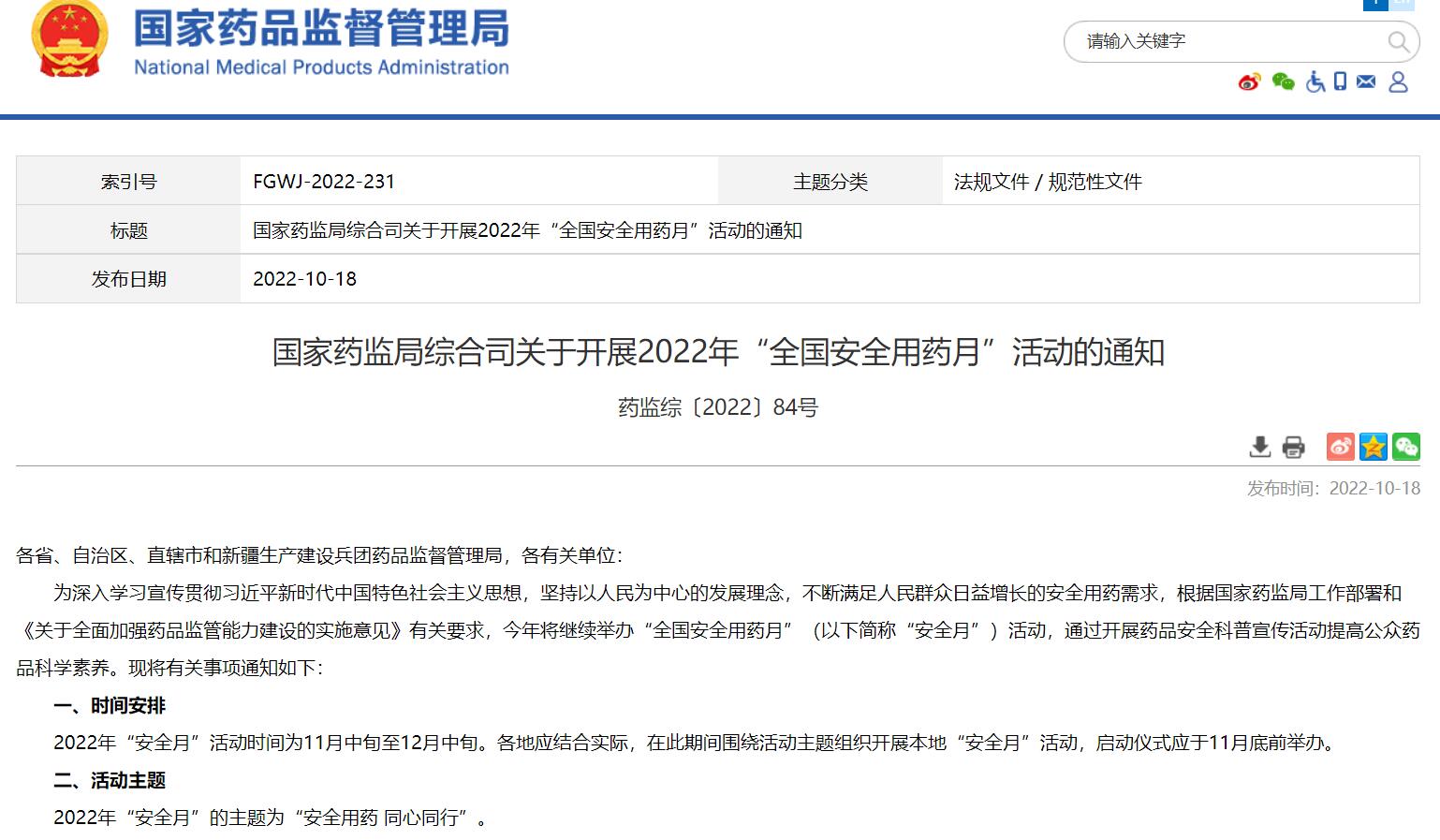 國家藥監(jiān)局綜合司關(guān)于開展2022年“全國安全用藥月”活動的通知
