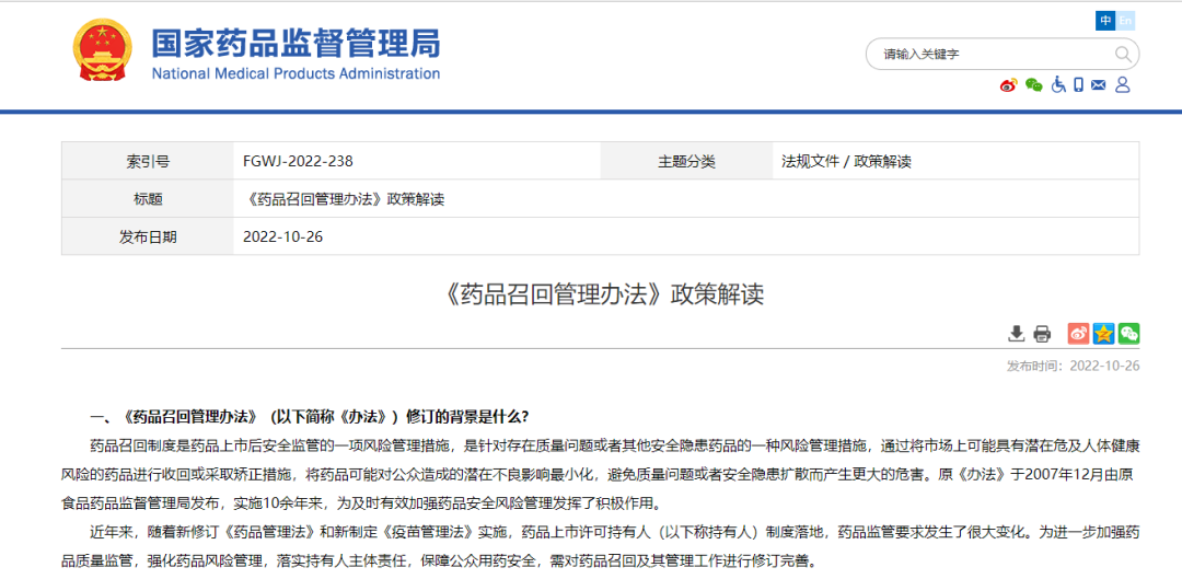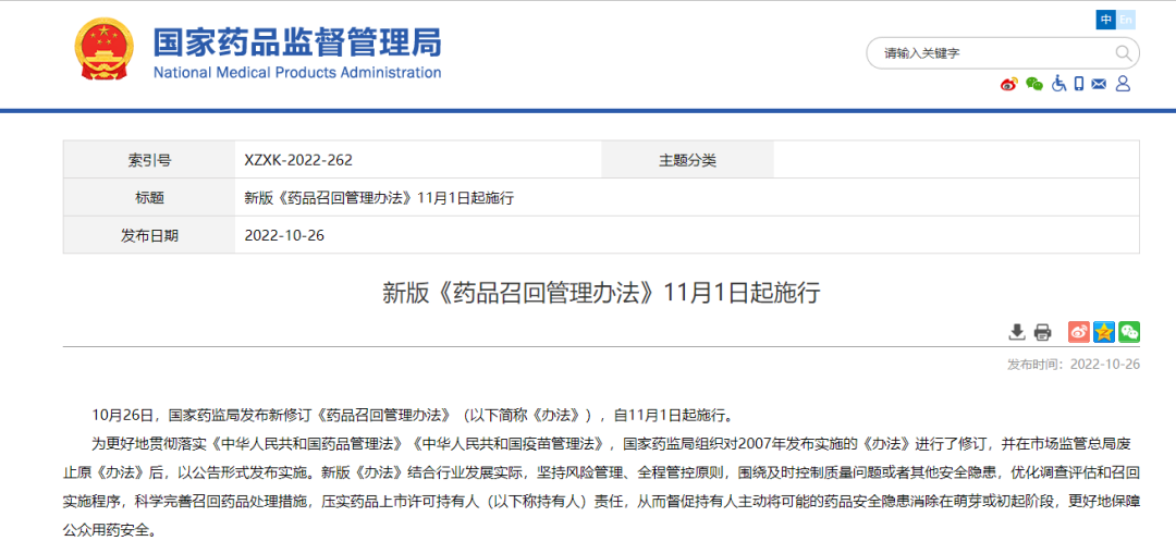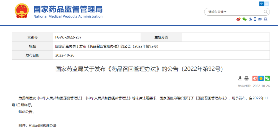 國家藥監(jiān)局關于發(fā)布《藥品召回管理辦法》的公告(2022年第92號)