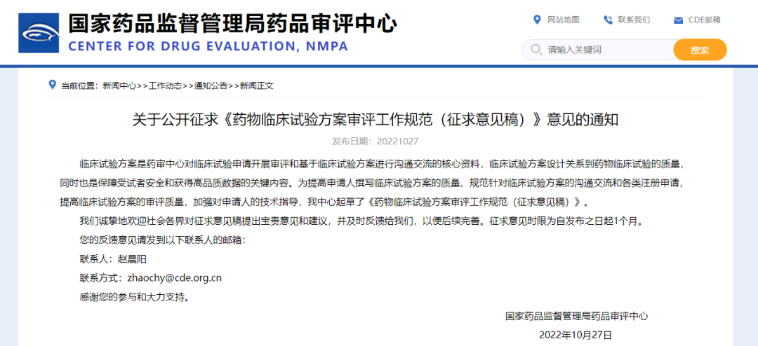 關于公開征求《藥物臨床試驗方案審評工作規(guī)范(征求意見稿)》意見的通知