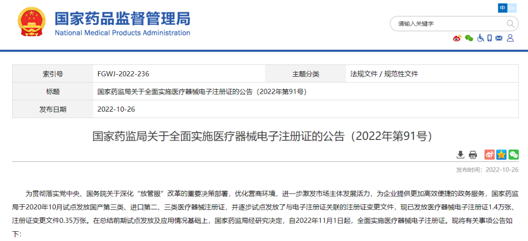 國家藥監(jiān)局關于全面實施醫(yī)療器械電子注冊證的公告(2022年第91號)