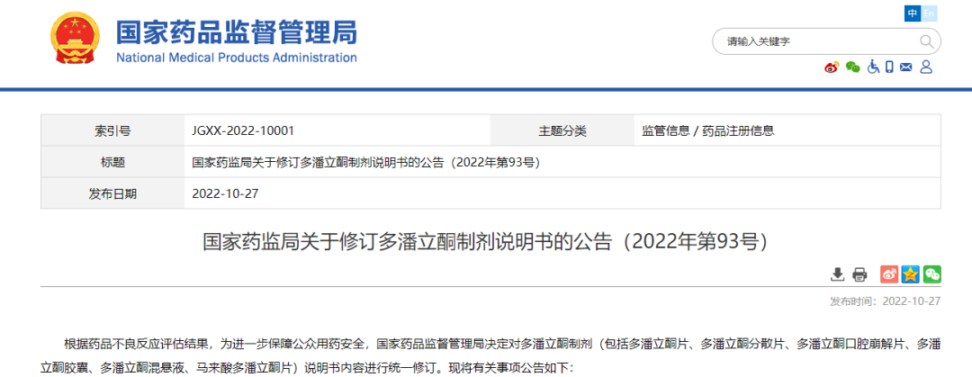 國家藥監(jiān)局關于修訂多潘立酮制劑說明書的公告(2022年第93號)