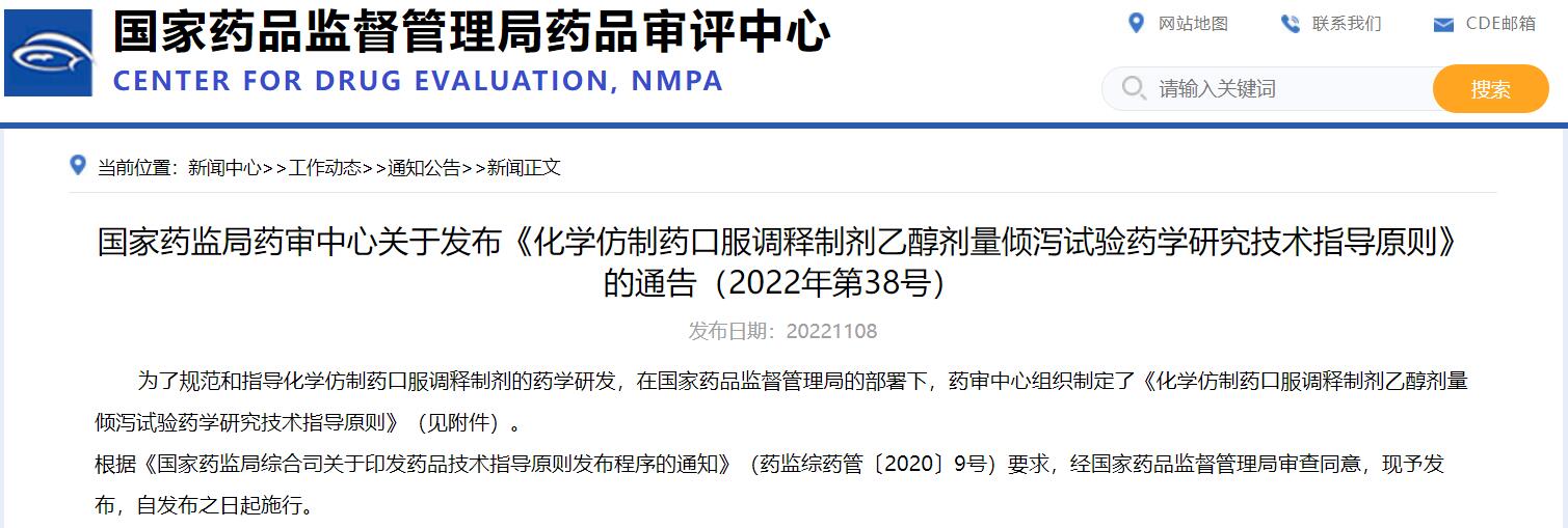 國家藥監(jiān)局藥審中心關(guān)于發(fā)布《化學(xué)仿制藥口服調(diào)釋制劑乙醇劑量?jī)A瀉試驗(yàn)藥學(xué)研究技術(shù)指導(dǎo)原則》的通告(2022年第38號(hào))