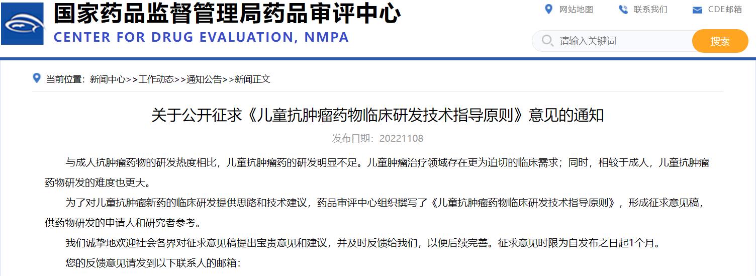 關(guān)于公開征求《兒童抗腫瘤藥物臨床研發(fā)技術(shù)指導(dǎo)原則》意見的通知