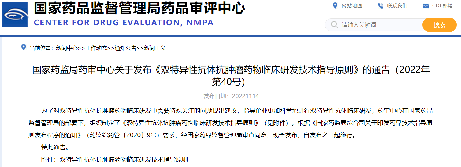 國(guó)家藥監(jiān)局藥審中心關(guān)于發(fā)布《雙特異性抗體抗腫瘤藥物臨床研發(fā)技術(shù)指導(dǎo)原則》的通告(2022年第40號(hào))