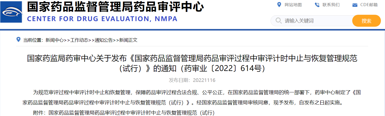 國(guó)家藥監(jiān)局藥審中心關(guān)于發(fā)布《國(guó)家藥品監(jiān)督管理局藥品審評(píng)過(guò)程中審評(píng)計(jì)時(shí)中止與恢復(fù)管理規(guī)范(試行)》的通知(藥審業(yè)〔2022〕614號(hào))