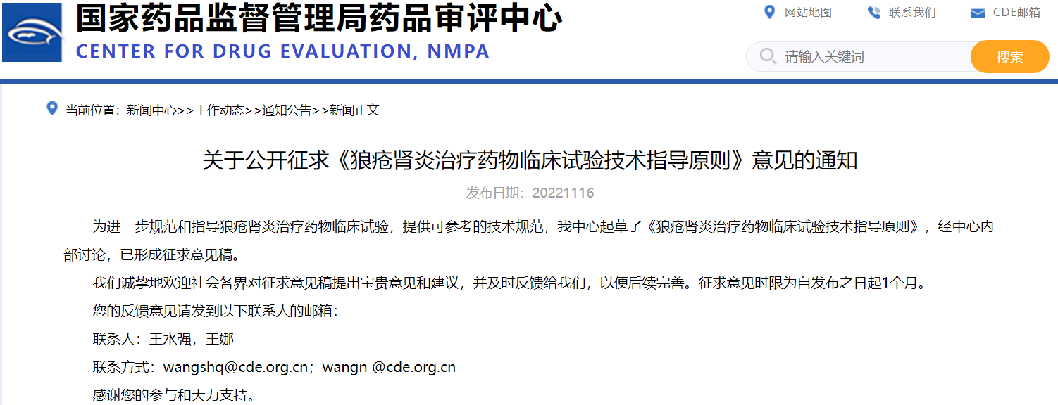 關(guān)于公開征求《狼瘡腎炎治療藥物臨床試驗(yàn)技術(shù)指導(dǎo)原則》意見的通知