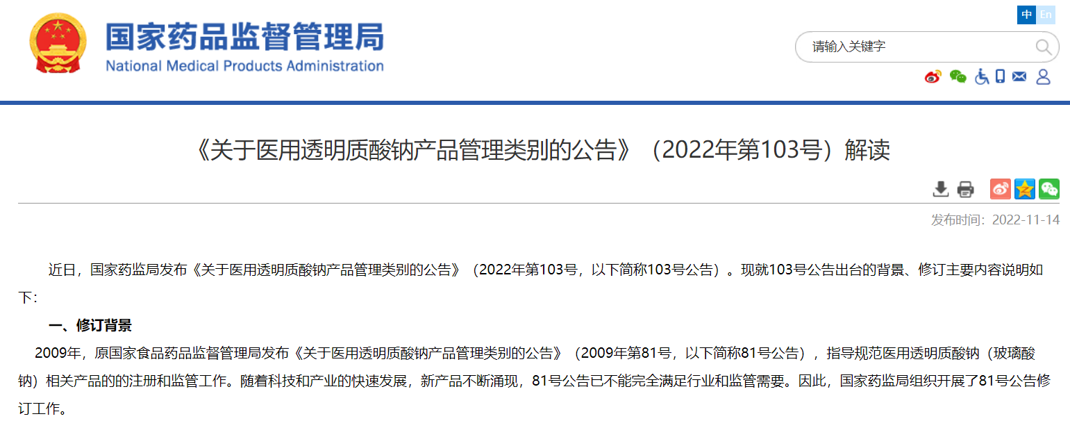 國(guó)家藥監(jiān)局關(guān)于醫(yī)用透明質(zhì)酸鈉產(chǎn)品管理類別的公告(2022年第103號(hào))