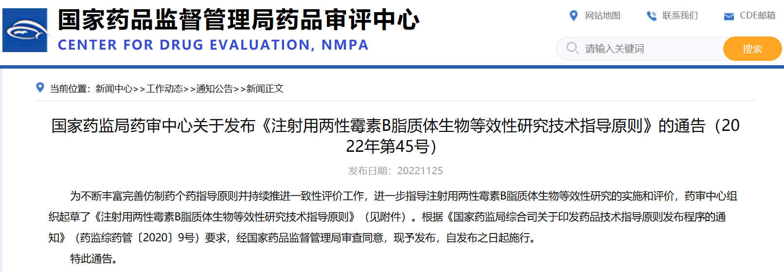 國家藥監(jiān)局藥審中心關(guān)于發(fā)布《注射用兩性霉素B脂質(zhì)體生物等效性研究技術(shù)指導(dǎo)原則》的通告(2022年第45號)