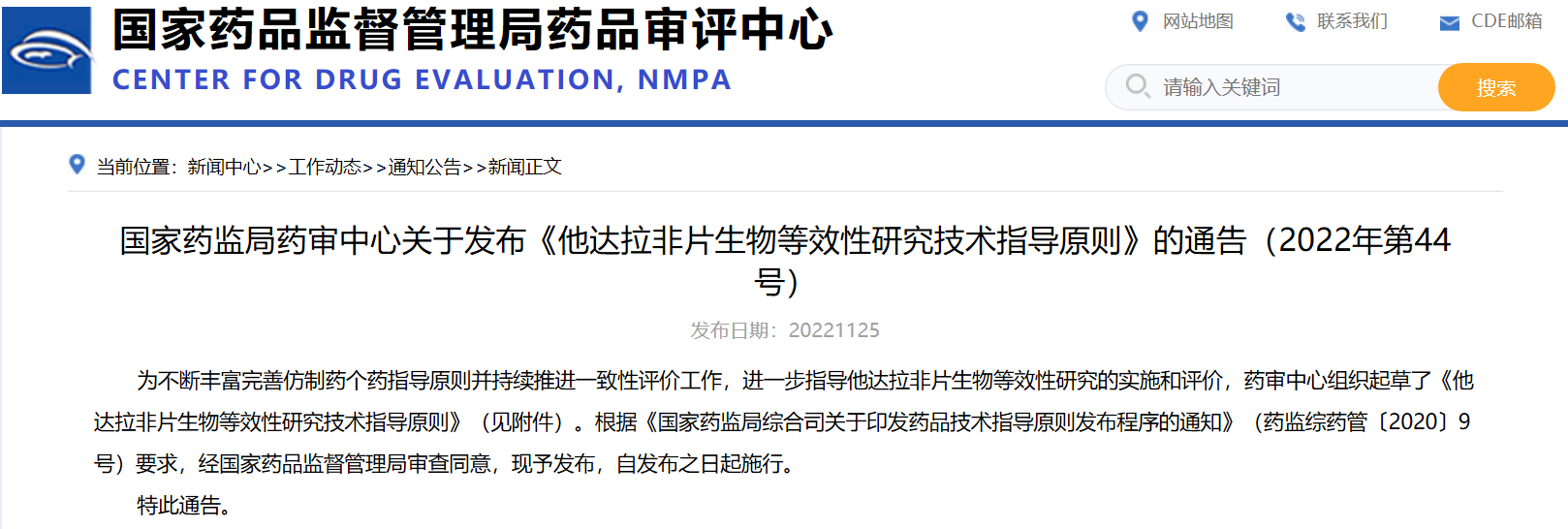 國家藥監(jiān)局藥審中心關(guān)于發(fā)布《他達拉非片生物等效性研究技術(shù)指導(dǎo)原則》的通告(2022年第44號)