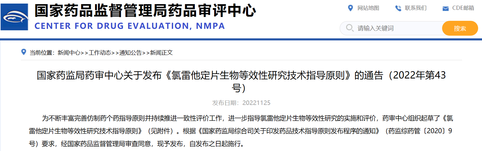 國家藥監(jiān)局藥審中心關(guān)于發(fā)布《氯雷他定片生物等效性研究技術(shù)指導(dǎo)原則》的通告(2022年第43號)