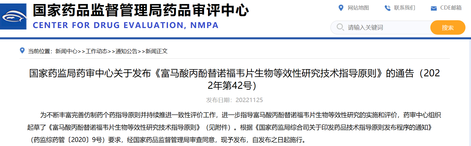國家藥監(jiān)局藥審中心關(guān)于發(fā)布《富馬酸丙酚替諾福韋片生物等效性研究技術(shù)指導(dǎo)原則》的通告(2022年第42號)