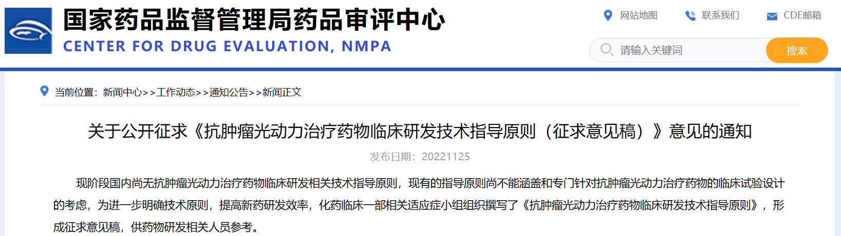 關(guān)于公開征求《抗腫瘤光動力治療藥物臨床研發(fā)技術(shù)指導(dǎo)原則(征求意見稿)》意見的通知