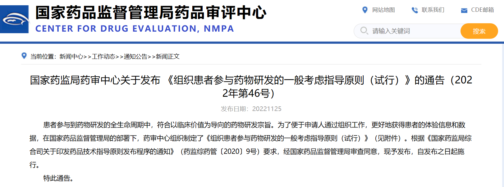 國家藥監(jiān)局藥審中心關(guān)于發(fā)布 《組織患者參與藥物研發(fā)的一般考慮指導(dǎo)原則(試行)》的通告(2022年第46號)
