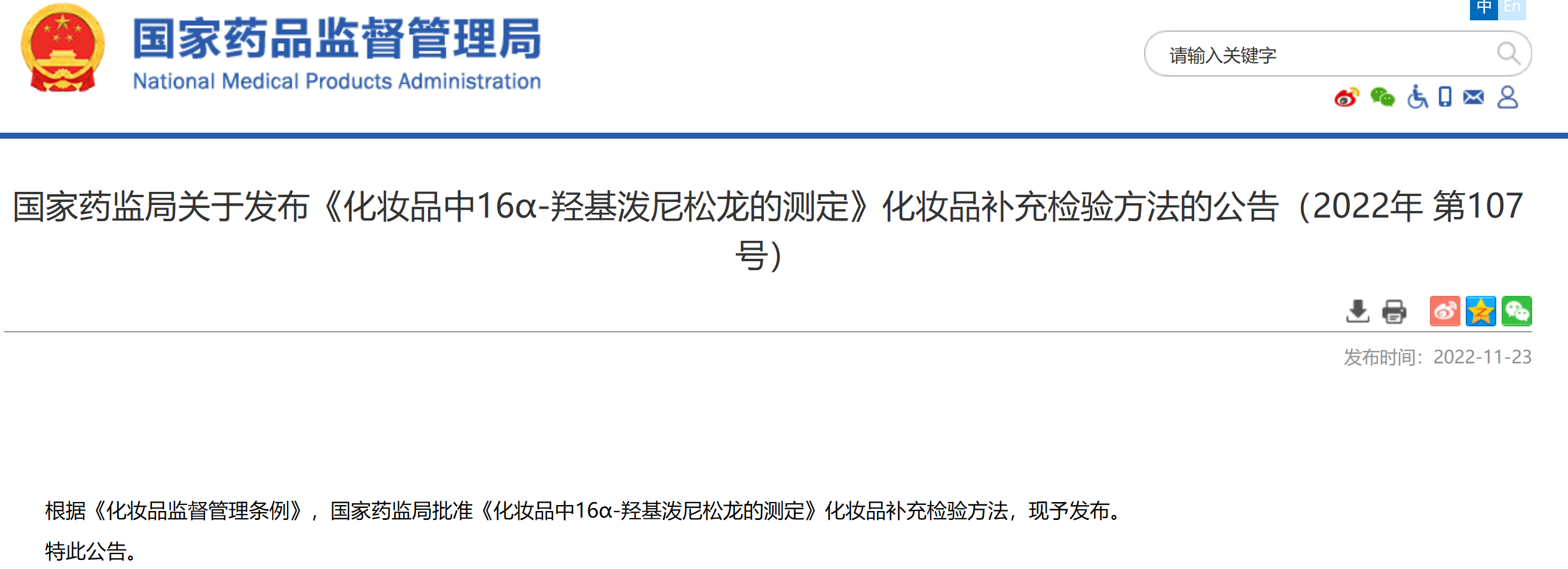 國家藥監(jiān)局關(guān)于發(fā)布《化妝品中16α-羥基潑尼松龍的測定》化妝品補充檢驗方法的公告