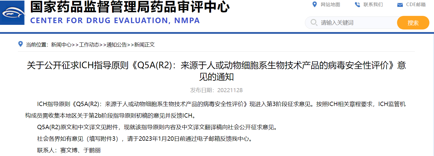 關(guān)于公開(kāi)征求ICH指導(dǎo)原則《Q5A(R2):來(lái)源于人或動(dòng)物細(xì)胞系生物技術(shù)產(chǎn)品的病毒安全性評(píng)價(jià)》意見(jiàn)的通知