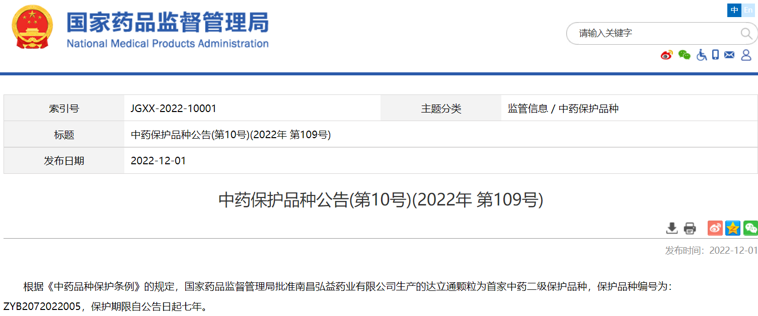 中藥保護(hù)品種公告(第10號(hào))(2022年 第109號(hào))