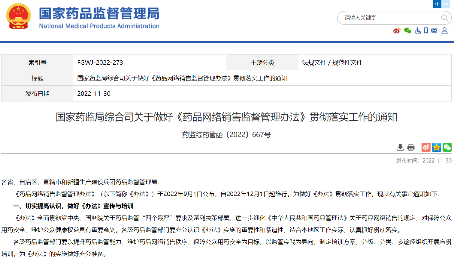 國(guó)家藥監(jiān)局綜合司關(guān)于做好《藥品網(wǎng)絡(luò)銷售監(jiān)督管理辦法》貫徹落實(shí)工作的通知