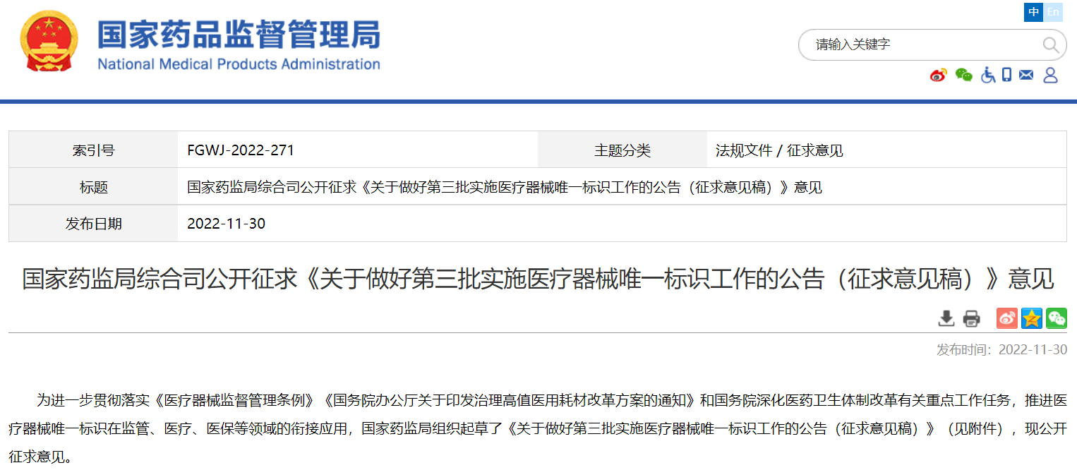國(guó)家藥監(jiān)局綜合司公開(kāi)征求《關(guān)于做好第三批實(shí)施醫(yī)療器械唯一標(biāo)識(shí)工作的公告(征求意見(jiàn)稿)》意見(jiàn)