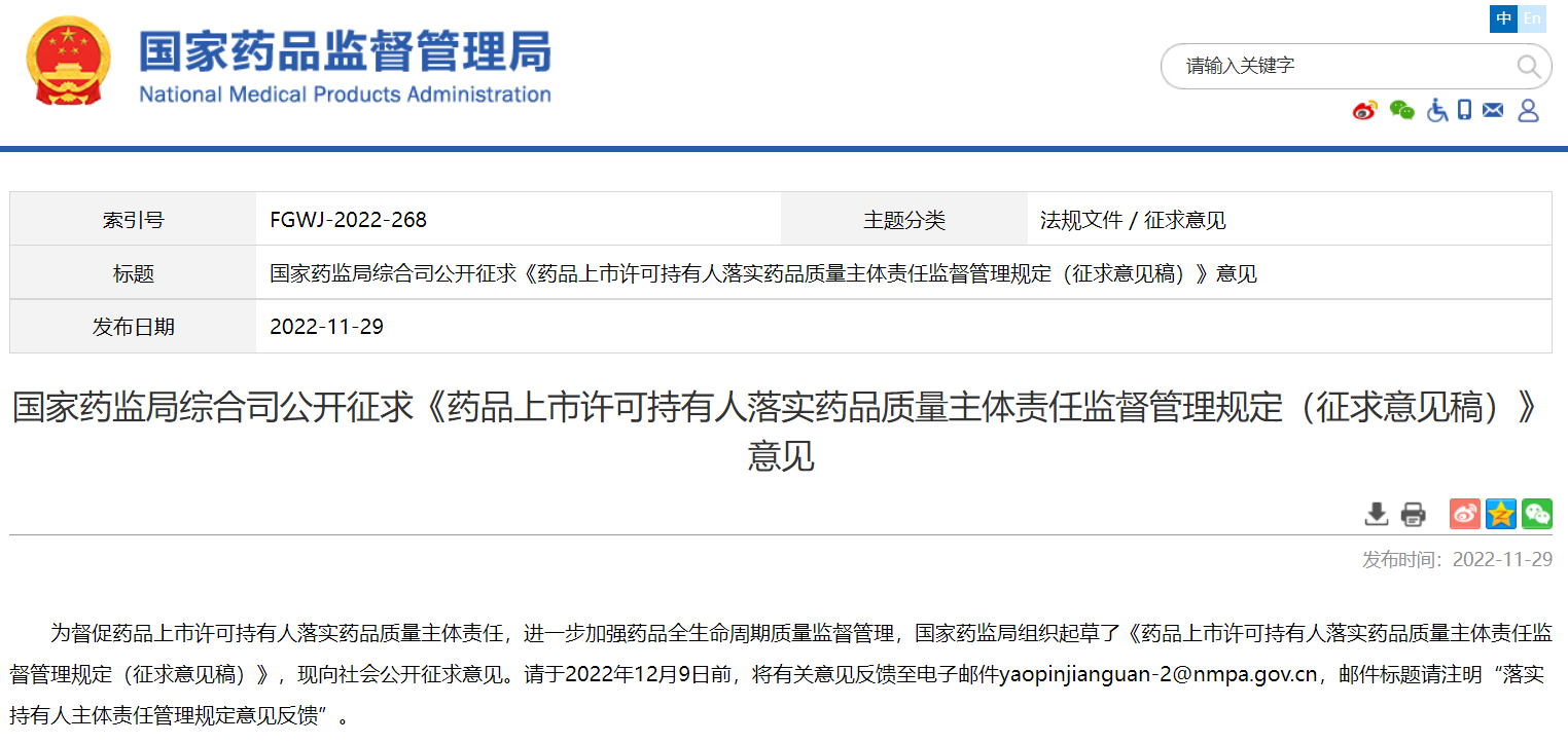 國(guó)家藥監(jiān)局綜合司公開(kāi)征求《藥品上市許可持有人落實(shí)藥品質(zhì)量主體責(zé)任監(jiān)督管理規(guī)定》意見(jiàn)