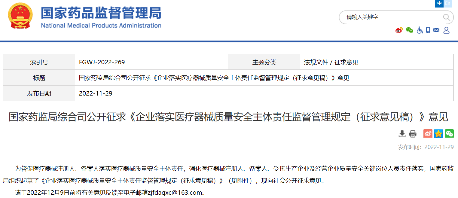 國(guó)家藥監(jiān)局綜合司公開(kāi)征求《企業(yè)落實(shí)醫(yī)療器械質(zhì)量安全主體責(zé)任監(jiān)督管理規(guī)定(征求意見(jiàn)稿)》意見(jiàn)