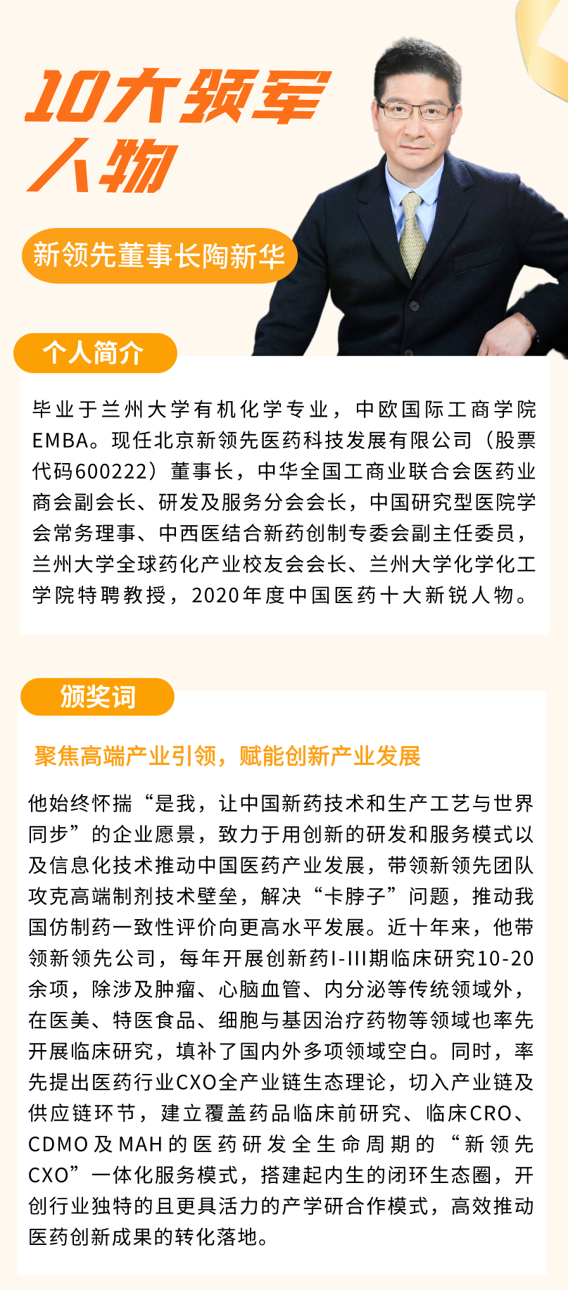 “此次,能與揚(yáng)子江藥業(yè)徐浩宇董事長、石藥集團(tuán)蔡東晨董事長、邁瑞生物李西廷董事長等優(yōu)秀的企業(yè)家一起成為10大領(lǐng)軍人物,深感榮幸,同時,也是行業(yè)對新領(lǐng)先CXO全產(chǎn)業(yè)鏈服務(wù)模式的認(rèn)可。新藥的研發(fā)是基于滿足未被滿足的臨床需要,同時實(shí)現(xiàn)商業(yè)轉(zhuǎn)化,產(chǎn)生商業(yè)價值,否則便不是真正的新藥。新領(lǐng)先CXO模式可以幫助研發(fā)企業(yè)以終為始,通過頂層設(shè)計,閉環(huán)快速地完成目標(biāo),節(jié)省社會資源,倍增社會價值。未來新領(lǐng)先將繼續(xù)致力于用創(chuàng)新的研發(fā)和服務(wù)模式,與醫(yī)藥業(yè)同仁一起創(chuàng)造開放的積木式研發(fā)生態(tài)”陶新華董事長在采訪中表示。