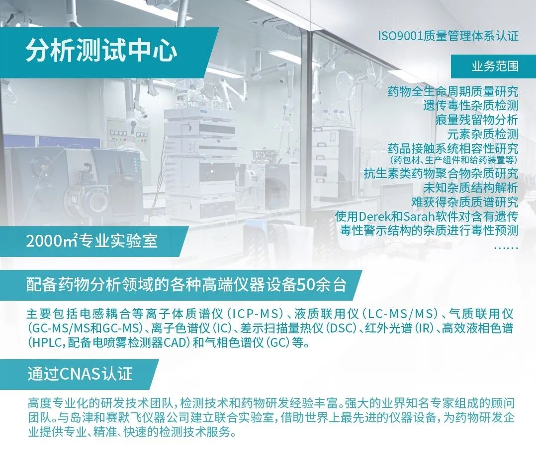 分析測試中心自2014年起獨立開展藥品研發(fā)工作,積累了豐富的藥物質量研究經驗,主要提供痕量物質,如遺傳毒性雜質、元素雜質、殘留溶劑、聚合物雜質、復雜制劑輔料剖析、藥品接觸系統(tǒng)相容性研究等符合NMPA、FDA、EMA等法規(guī)要求的研究檢測服務。