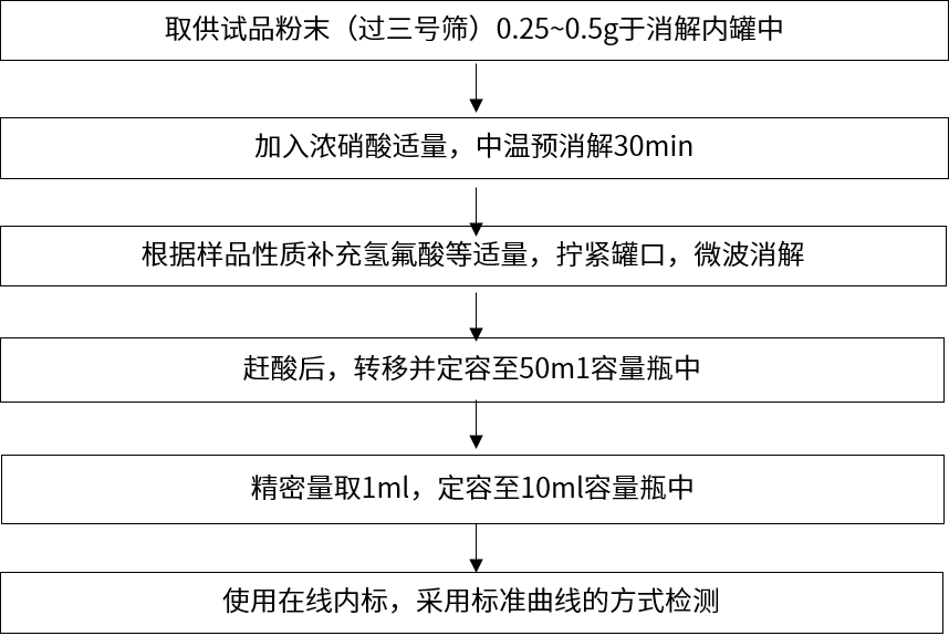 案例二:新領(lǐng)先醫(yī)藥分析測(cè)試中心使用電感耦合等離子體質(zhì)譜儀(ICP-MS)進(jìn)行了中藥材中的鉛、鎘、砷、汞、銅等元素的的檢測(cè)。ICP-MS元素檢測(cè)的前處理方法流程如下: